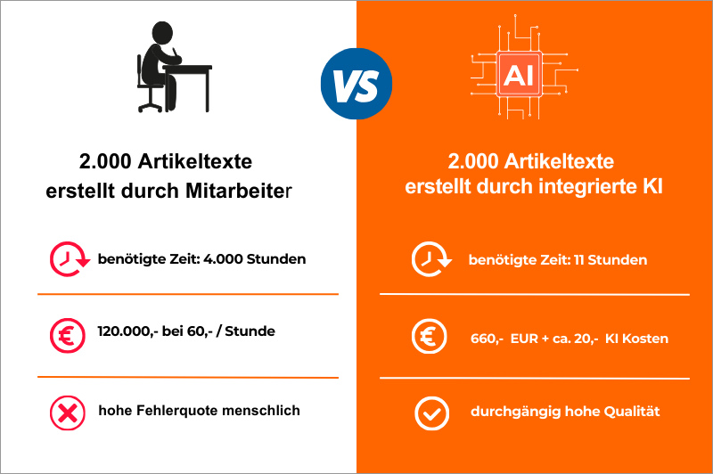 Mit der KI-Integration für automatisierte Artikeltexterstellung reduziert sich dieser Aufwand auf einen Bruchteil — bei gleichzeitig höherer Qualität.