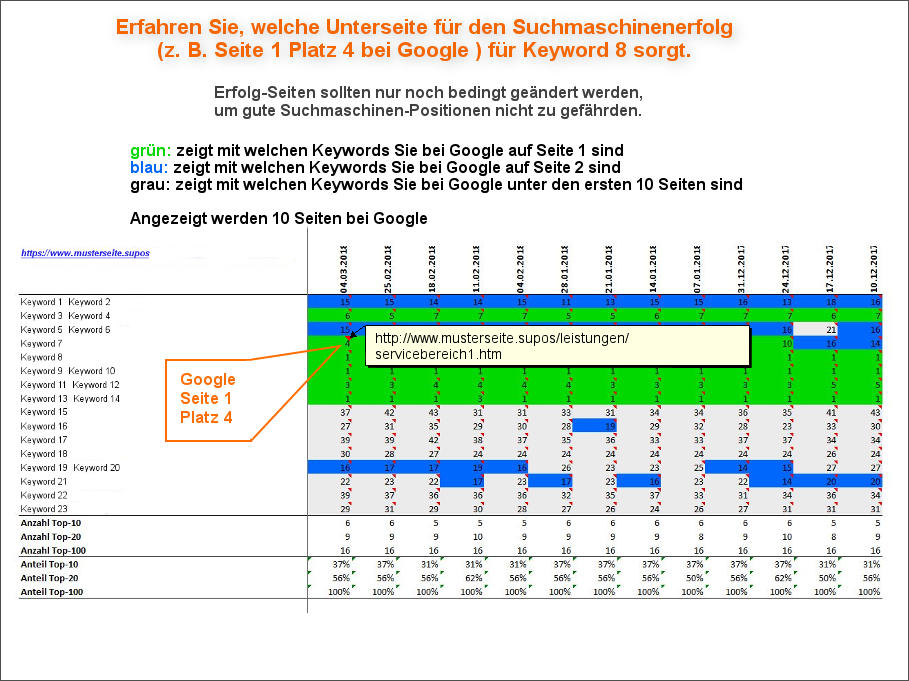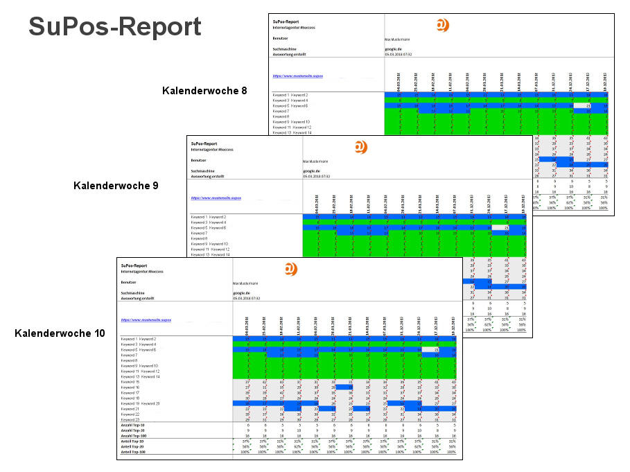Hilfe bei einer wöchentlichen Auswertung Ihrer aktuellen Suchmaschinen-Situation erhalten Sie durch unseren SuPos-Report.
